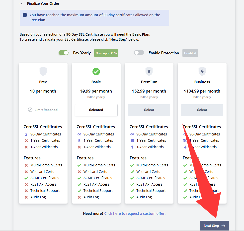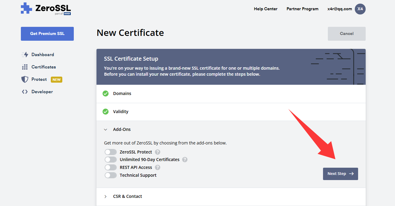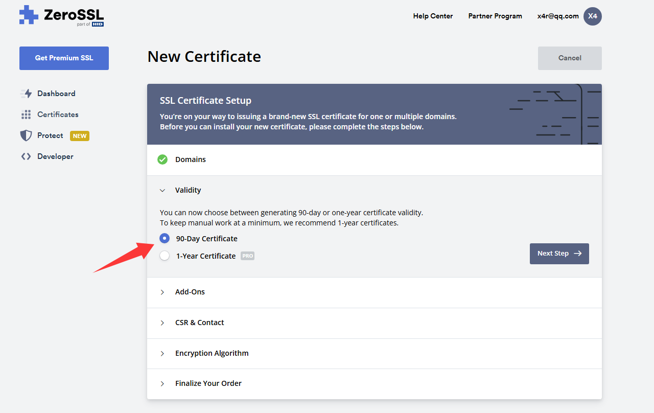 选择证书时长,免费就90天,1年的收费,继续Next Step下一步