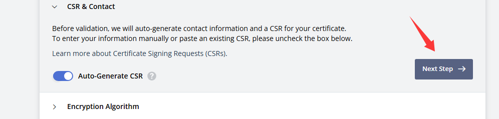 CSR & Contact这个是勾选自动生成CSR也就是认证信息,默认会勾选,依旧Next Step下一步