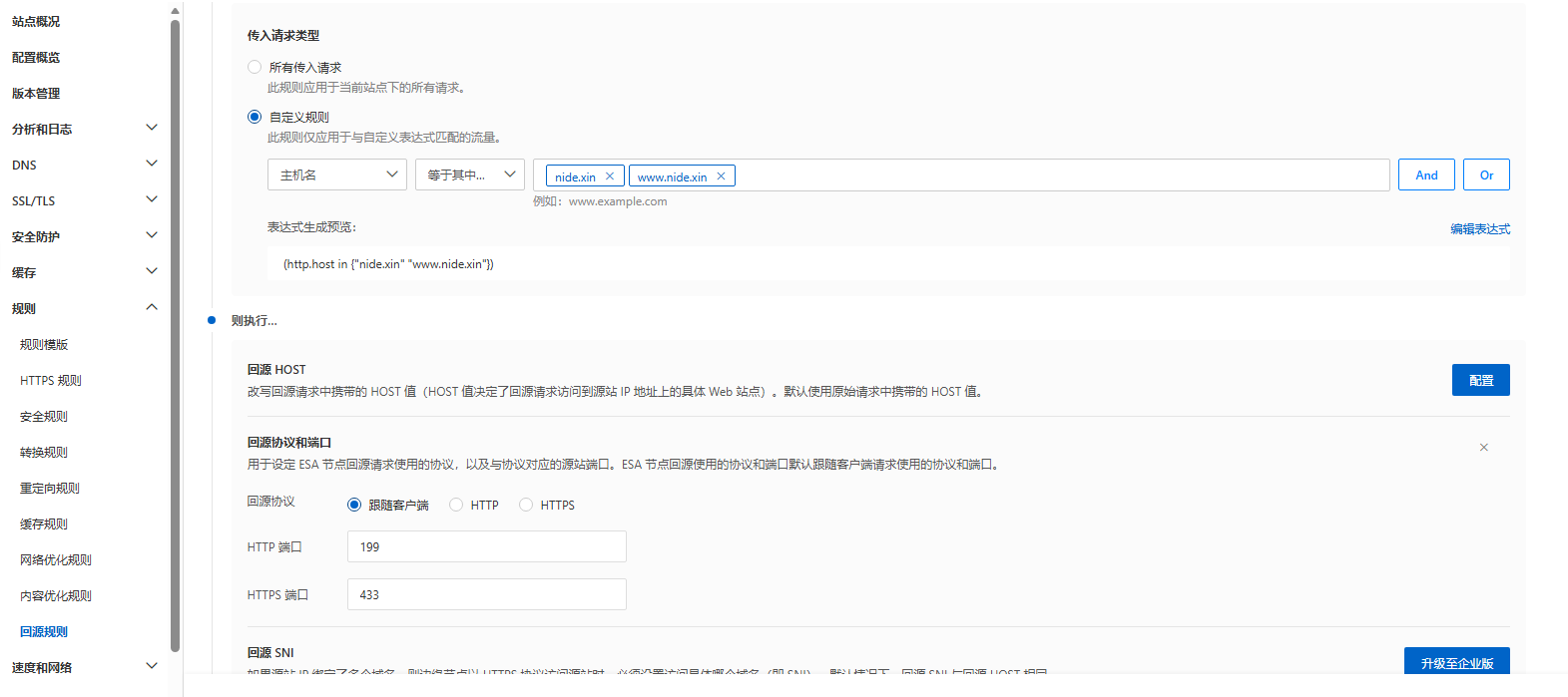 如图所示,站点管理 - 规则 - 回源规则