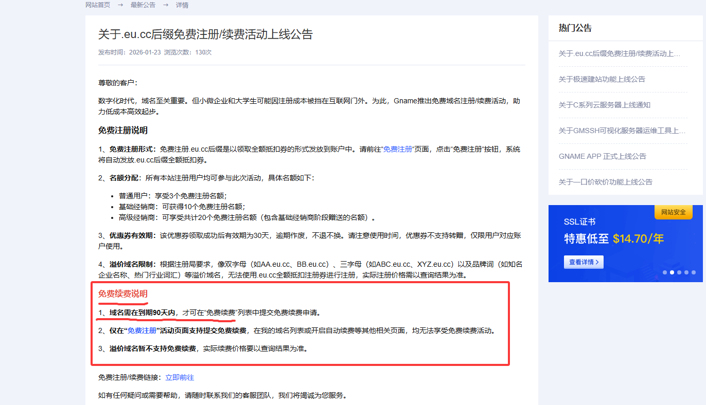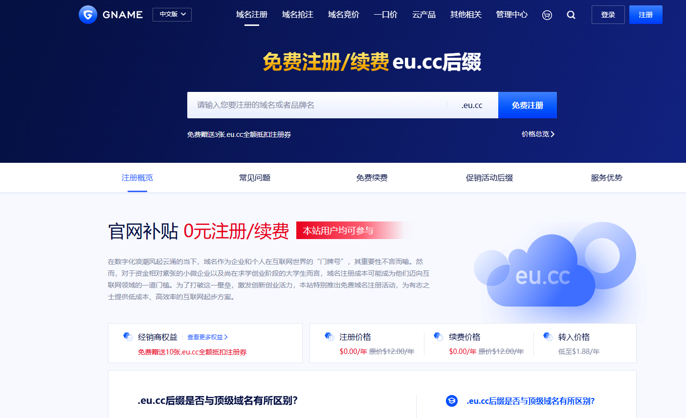 知名注册商GNAME推出限时福利,免费为每个用户提供最多3个 .eu.cc 域名注册资格,无需付费任何费用,到期前90天可以免费续费,速来领取!