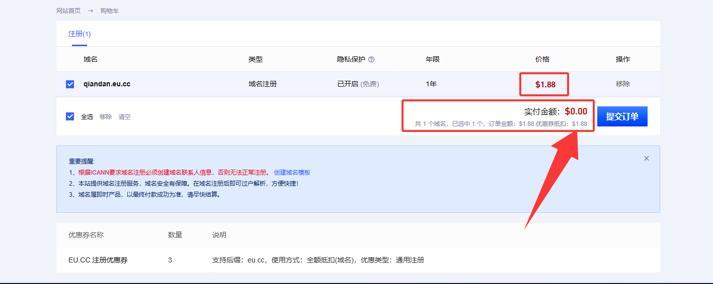 - 搜索并注册域名 输入你想要的域名(如:yourname.eu.cc),查看是否可注册,选择后加入购物车,结算时选择“免费”选项,完成注册。