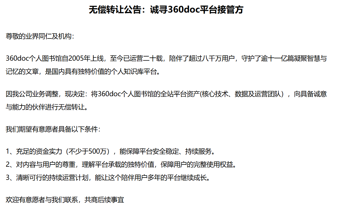 今天逛360doc.com发现这个网站发布公告,居然是无偿转让的公告,“因我公司业务调整,现决定:将360doc个人图书馆的全站平台资产(核心技术、数据及运营团队),向具备诚意与能力的伙伴进行无偿转让。”一个拥有百万IP的文章站,就此落幕了,估计是因为AI的崛起,导致这类文章站,简直毫无意义,目前网站无https,可能SSL证书也不想续费了,网站留给有缘人继续做把