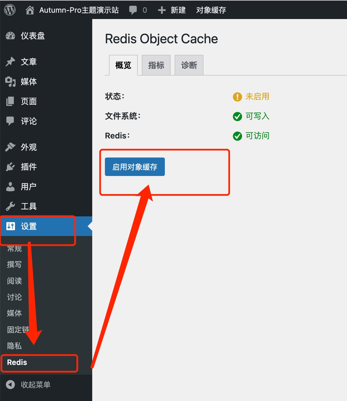 最后在wordpress后台启用redis缓存即可。