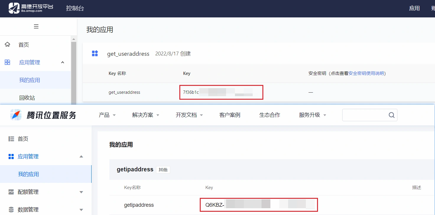 2. 注册高德开发平台和腾讯位置服务Web服务应用,获得两个 Key。