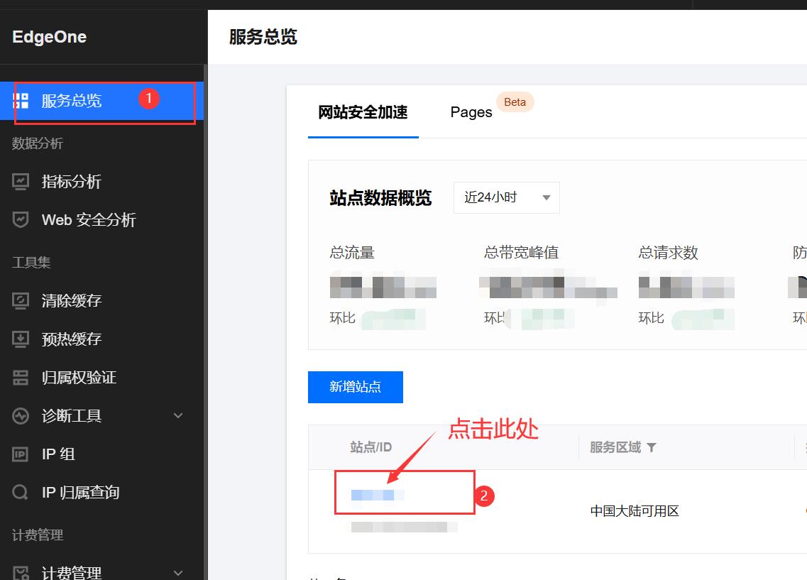 登录 边缘安全加速平台 EO 控制台,在左侧菜单栏中,进入服务总览,单击网站安全加速内需配置的站点。