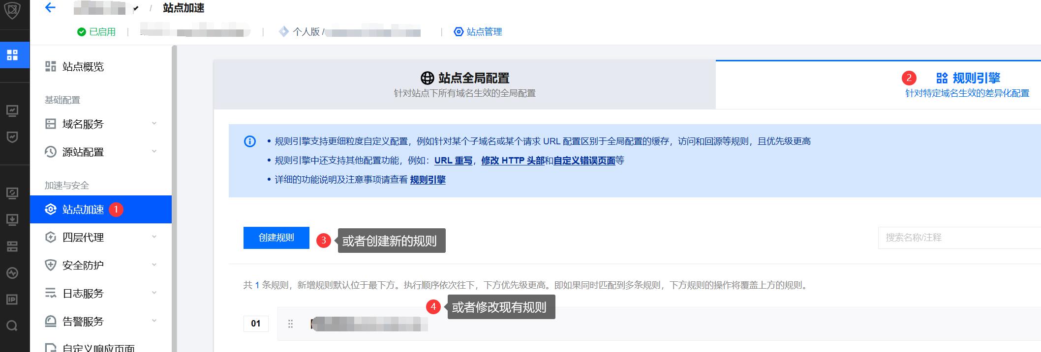 在站点详情页面,单击站点加速,进入站点全局配置页面,单击规则引擎 Tab 页。