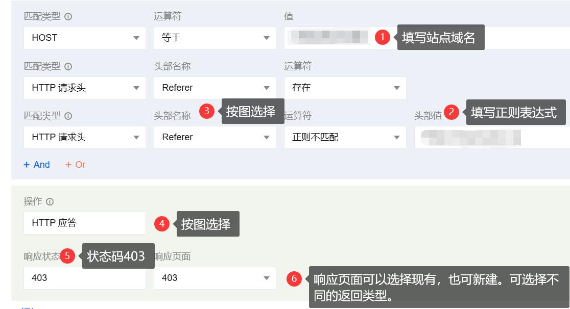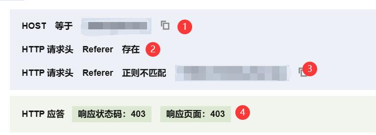 站点域名,同时设置匹配类型 HTTP 请求头 Referer 头部值正则不匹配站点域名的正则表达式。